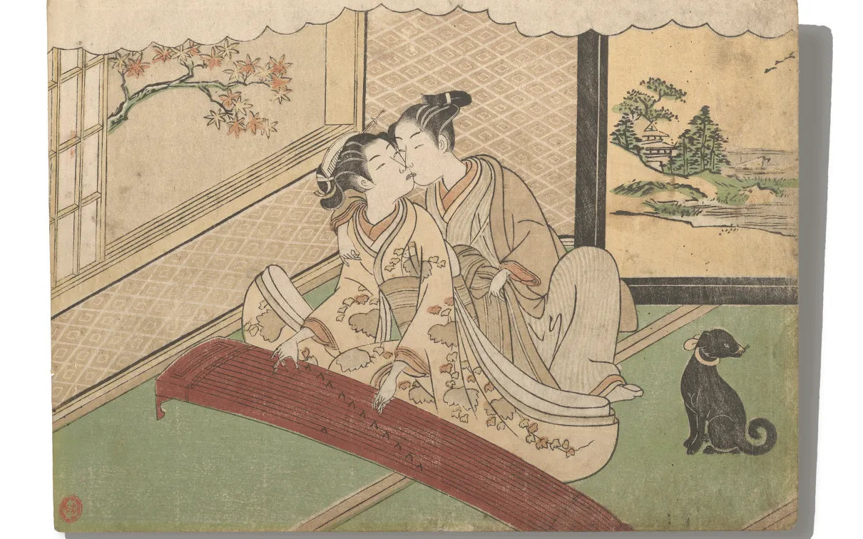 Suzuki Harunobu 鈴木春信 (c.1725-1770), Two lovers: a wakashu and a young woman kiss, Edo period, 1768-1770, woodblock print on paper, 18.5 x 25.7 cm, Sir Edmund Walker Collection.