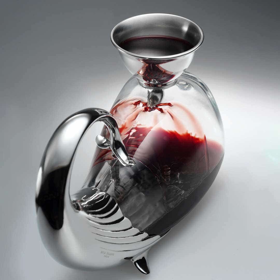 The Mediterranean is home to several species of cetaceans, including the fin whale, the world’s second largest mammal. Taking full advantage of its source of inspiration, the novelty whale decanter includes a specially designed companion funnel which spouts wine to cascade down the inner walls, working in tandem with the decanter’s recumbent form to maximise aeration. In glass and brilliant finish pewter.