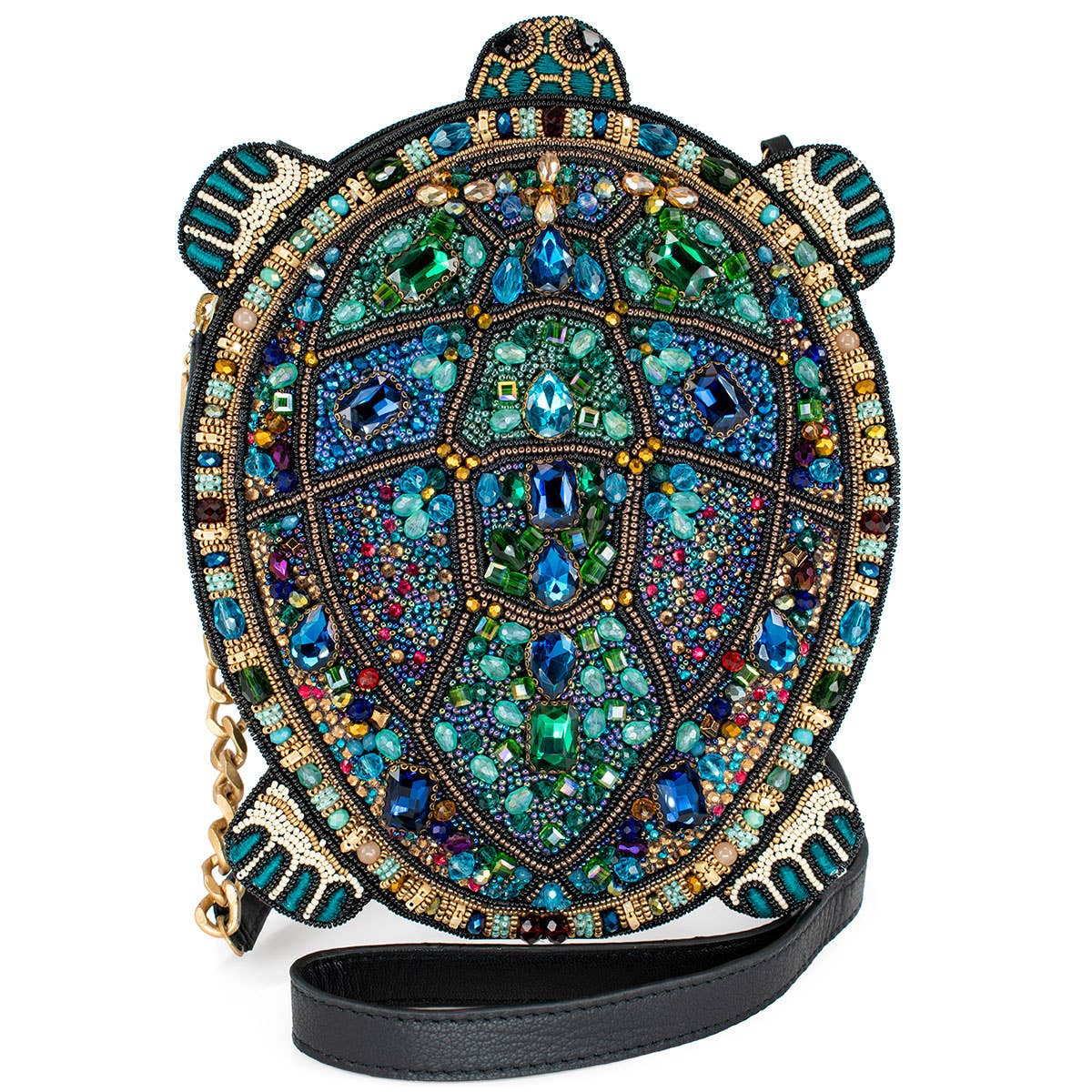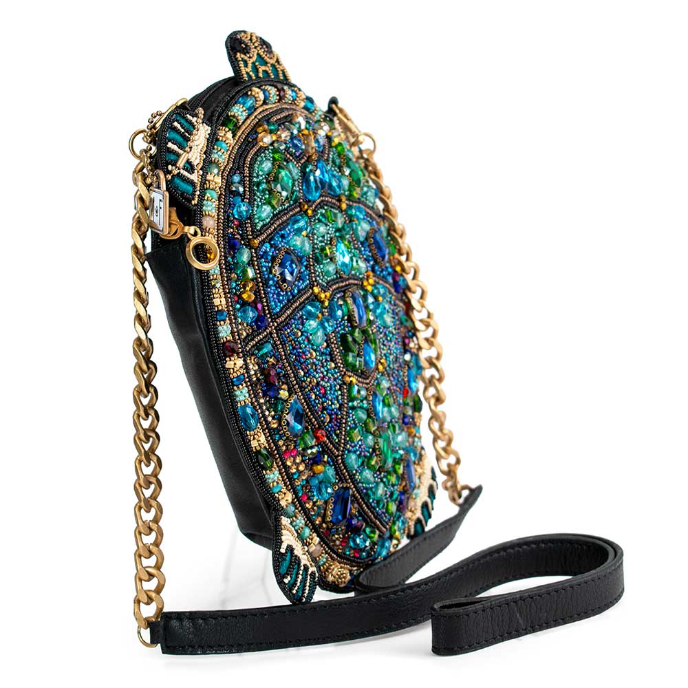 Shine bright with this playful turtle handbag. Adorned with sparkling gems & beads in rich jewel tones, this crossbody purse is sure to make a statement and bring some fun to your day.