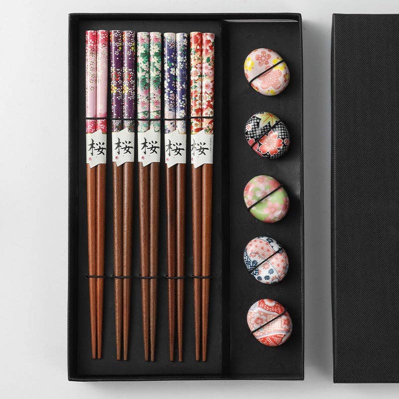 Set of 5 Pairs of Japanese Cherry Blossom Wooden Chopsticks and Rests