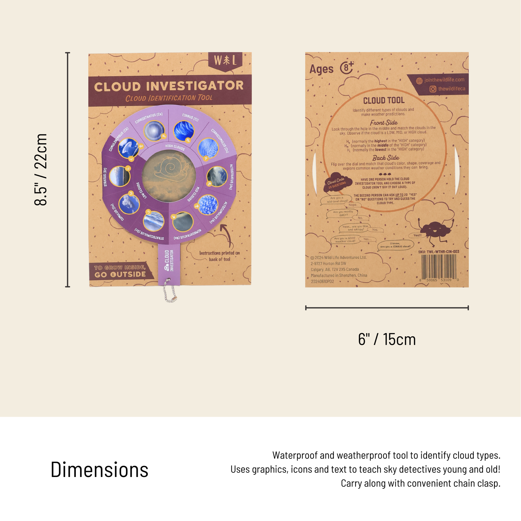 Master the art of skywatching with the Cloud Investigator, your ultimate tool for outdoor learning and adventure! Designed to help explorers of all ages identify cloud types quickly and accurately, this durable weatherproof sky guide makes outdoor forecasting fun and educational. Crafted from high-quality 24PT laminated material, the Cloud Investigator is built to withstand rain, wind, and every adventure in between. Its compact, lightweight design includes a chain loop for easy attachment to backpacks or carabiners, perfect for hiking, camping, scouting, or classroom exploration.
