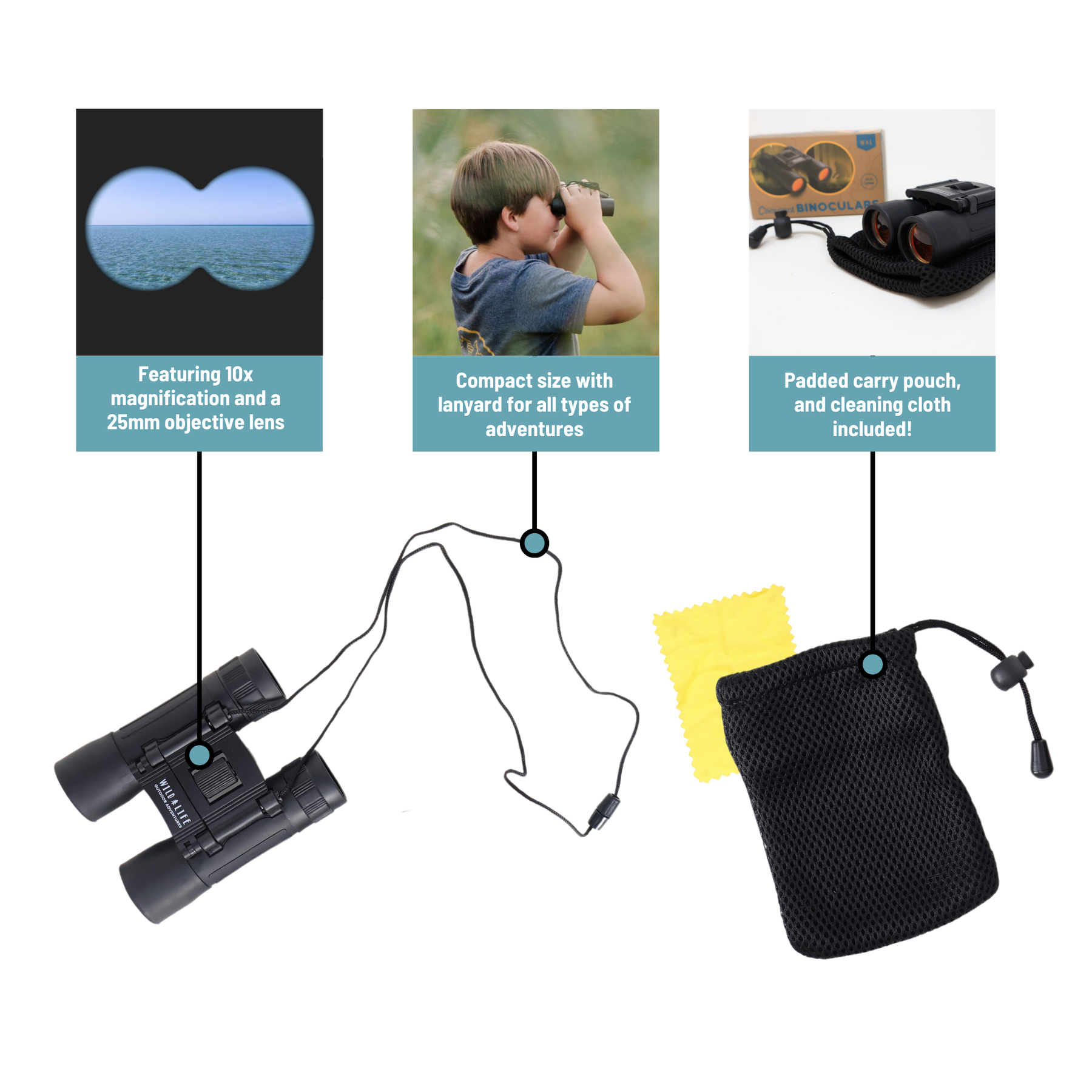 With 10x magnification, a 25mm objective lens, and fully coated optics for bright, clear viewing, these binoculars deliver impressive clarity and range in a sleek, durable design. Each set comes with a neck strap, carrying pouch (featuring a carabiner loop), and a cleaning cloth, everything needed for adventure-ready exploration.