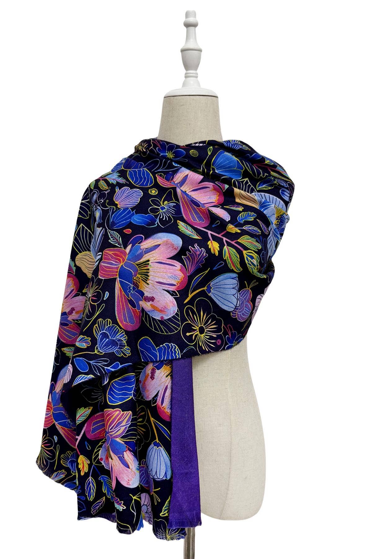 Colourful Orchid Print Wool Frayed Scarf