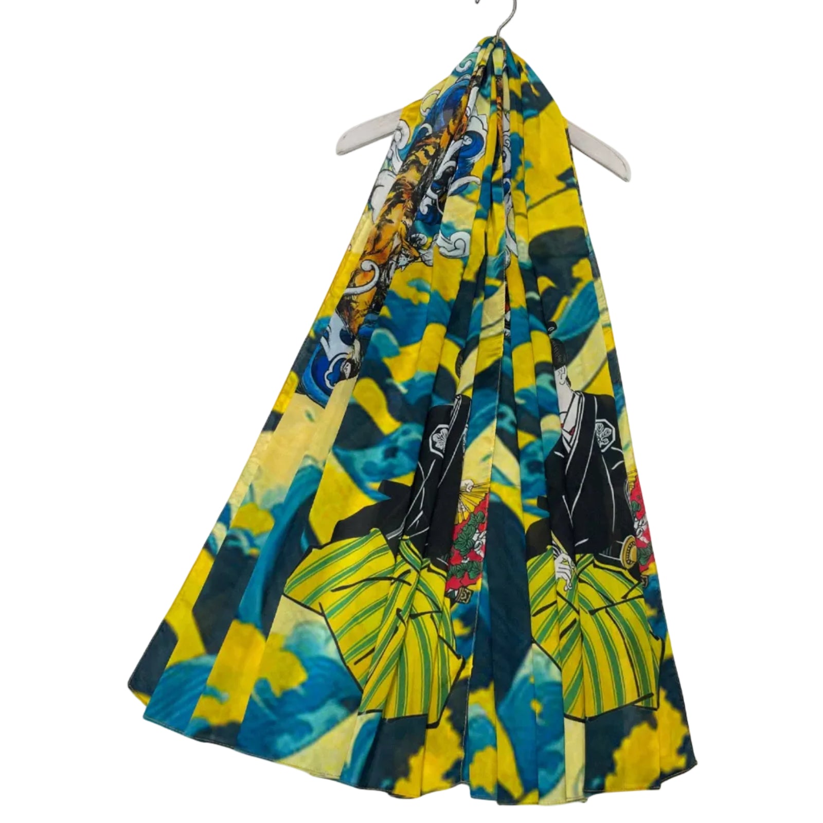 Japanese Tiger and Samurai Warrior Print Silk Scarf